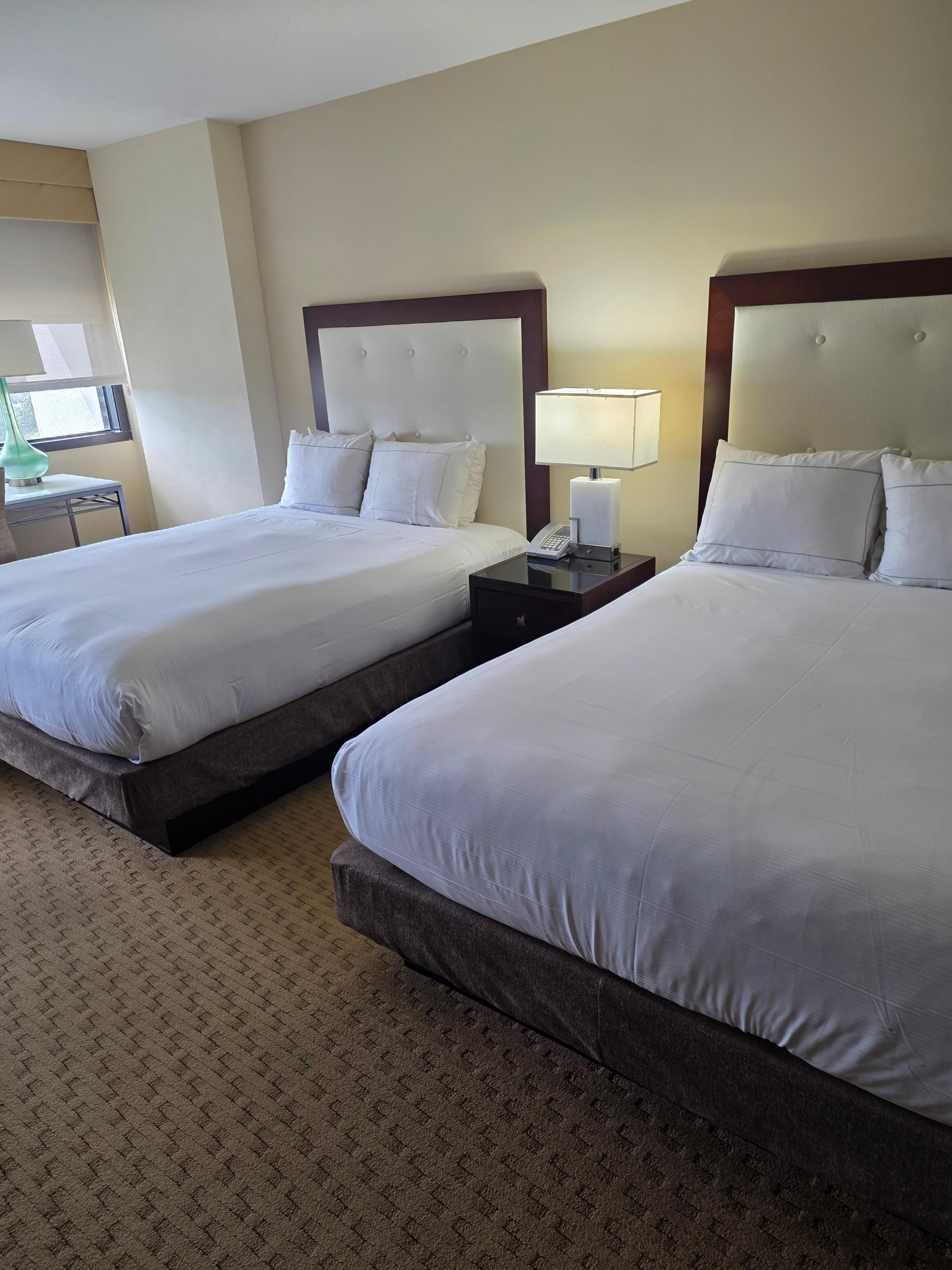 Bag check and use of pool and outdoor cafe was a huge plus while waiting for our room. I understand the hotel is going through a renovation, which it needs. The main lobby area is nice, comfortable and clean. The pool was spacious and refreshing. But as soon as you step in the elevators, you can feel the age of the building. Our room had a great view, but the bathroom was eekkk. There was mildew/mold in areas, the door was swollen from water leaking out of the shower and the glass on the door is transparent! Weird! The pillows were pretty awful too, and tiny. But the room was cool and quiet. A big reason we picked this hotel was the free airport shuttle- but we didn't know that doesn't start until 5 am and we needed to leave at 4:30 am. So just a heads up for travellers! I don't know if I would stay here again until the rooms are all refreshed. Pool food was pretty good.