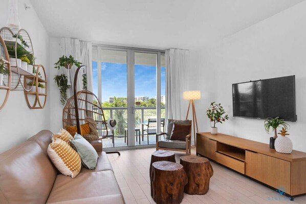 Spectacular Tropical Apartment at Beachwalk Resort. The building was designed by Pininfarina (Ferrari). Enjoy our spacious apartment with 2 bedrooms, master bedroom with King- sized bed, and a full bathroom, including a second room with 2 double beds and a full bathroom. There is comfortable full pullout sofa bed in the living room with smart tv. Resort fee will be charged at the check-in time at the property and it is not included.