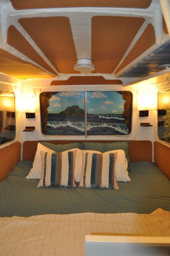 Welcome to The Miami Grotto, a restored vintage cruiser reimagined as a restorative sanctuary in the heart of Miami. The peaceful, teak-lined cabin offers a dark, cave-like escape from the city glare, featuring a king bed outfitted with luxurious silk sheets, year-round AC/heating, and a refreshing shower.