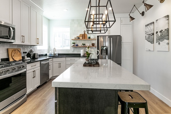 Inside, the open-concept main level welcomes you with high ceilings, expansive windows, and tasteful modern finishes. The spacious kitchen is fully equipped for your group, featuring quartz countertops, stainless steel appliances, and an open design perfect for gathering. Relax in the inviting living room or step outside onto the private deck to enjoy fresh mountain air and starry skies.