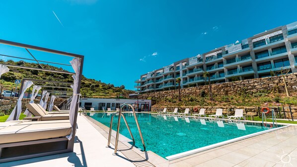 Modern 8-person apartment, large balcony and a central pool, hills of Mijas.