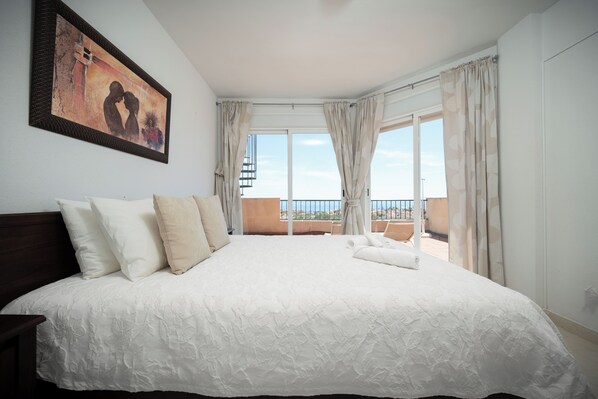 Bedrooms: Retreat to one of our three spacious bedrooms, each offering a sanctuary of comfort and style. Two of the bedrooms share access to a private terrace, where you can soak in the breathtaking vistas of the Alboran. The third bedroom boasts its own private terrace. With comfortable sleeping arrangements, our penthouse can accommodate up to nine guests, making it perfect for families or groups of friends.