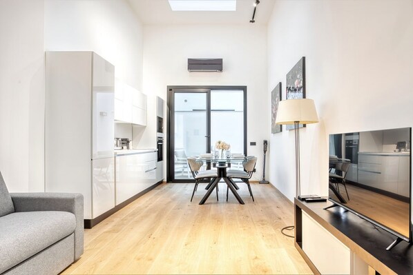 Un parquet chiaro e accogliente introduce l'ampia e luminosa zona living e pranzo, con affaccio su un giardino d'inverno arredato con sedute e tavolino (si prega di non fumare all'interno).