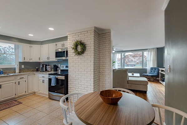 The large windows in the living room create a very bright and airy feel to this newly renovated single-level living brick home. The living room and kitchen are large and inviting. You will find 3 bedrooms; 2 with queen beds and 1 with a full bed and twin. The living room could also easily sleep someone on the sofa.