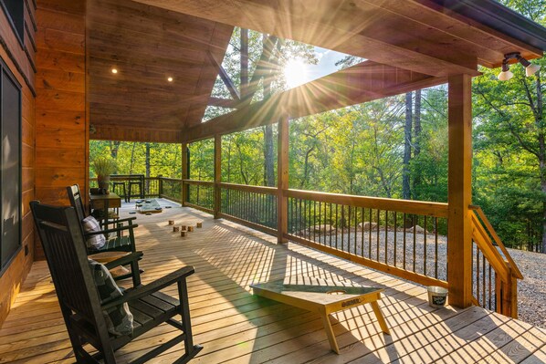 A stunning Blue Ridge Mountain getaway awaits when you choose this secluded cabin, tucked in the forest. You’re surrounded by wineries, hiking, biking, fishing, boating, and kayaking, among a plethora of outdoor recreation opportunities, while also being very close to Blue Ridge, McCaysville, Blairsville, Ellijay, and Murphy. Nonetheless, you’ll probably spend most of your time on the huge wraparound deck, perfect for morning coffee and evening cocktails. The new patio, just a few steps down from the deck, offers comfortable, and in the afternoon, shaded outdoor space to relax in. The enclosed sunroom, complete with an outdoor gas fireplace, TV, and comfortable seating area, is sure to become your favorite spot in the house. Then again, with seven distinct outside living areas to choose from, all of them are winners.