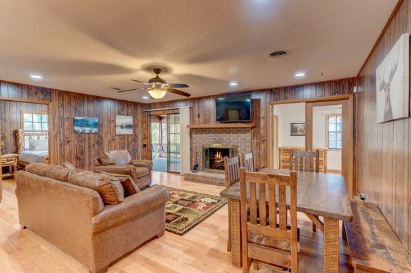 Escape to a secluded valley retreat and experience the natural beauty of the Cabin right by a beautiful creek. Enjoy breathtaking views or outdoor activities including fishing, biking, hiking or relaxing nature walks, etc. Book your stay and make lasting memories. This luxury cabin features beautiful custom finishes, modern-rustic décor, recreational room, a pool table, a hockey game table, and 2 fireplaces. Fire pit and sitting area in tree alley right outside the cabin.