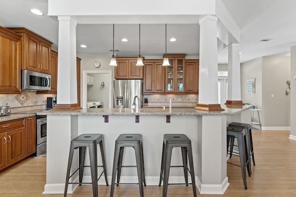 For guests’ convenience, there is a full-size washer and dryer and high speed WIFI is complimentary. Guests are welcomed to use the 6-passenger golf cart as well as the beach chairs, wagon and beach toys located in the garage.