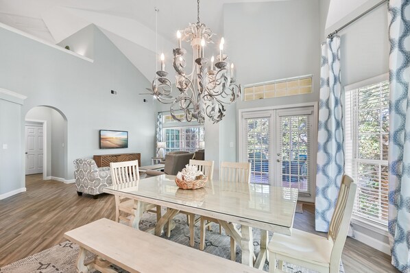 As soon as you step inside this home, you will be captivated by the cathedral ceilings and picturesque windows that overlook the lush green golf course. The 4 bedroom and 4 bath home can sleep up to 10 guests. The living area is roomy enough for everyone to feel relaxed and at home. The spacious kitchen features white countertops and stainless steel appliances and it is stocked with all the essentials you need to whip up a fantastic meal.