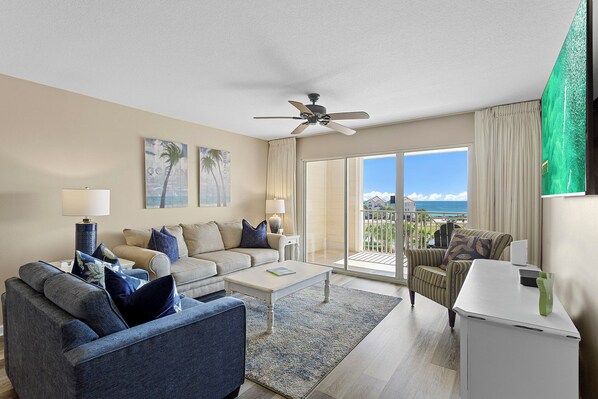 Perched on the top floor with postcard-perfect Gulf and pool views, Amalfi Coast 415B offers a serene coastal escape designed for both comfort and beauty. This spacious two-bedroom, two-bath condo sleeps up to six guests and features an inviting open layout filled with natural light. Floor-to-ceiling glass doors frame breathtaking views of the lagoon and shimmering Gulf beyond, creating the perfect backdrop for relaxation. The living area’s soothing neutral tones, plush seating, and large TV set the stage for cozy evenings, while the dining area and breakfast bar provide a welcoming space for meals and conversation. The fully updated kitchen includes granite countertops and stainless steel appliances for effortless dining at home. In the Primary Suite, you’ll wake each morning to sweeping Gulf views right from your king-size bed, with private balcony access and a sleek en suite bath featuring a walk-in shower. The Guest Bedroom offers a queen and twin bed with bright coastal accents, while a recessed bunk nook adds extra sleeping space—perfect for families.