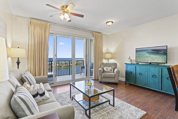 Upon entry, you're immediately greeted with tropical views through the sliding glass doors on one end of the living room. The doors open onto a breezy balcony furnished with an outdoor couch, chair, and drink table. There's nothing better than spending a romantic evening with your honey, watching the sunset over the beach, and enjoying a refreshing margarita. Inside, the condo is bright and welcoming with a beachy feel. The living room features a queen-size sleeper sofa paired with a matching armchair. The seating ensemble faces a flatscreen TV mounted atop a teal-blue entertainment cabinet. A plush rug and glass-topped drink table pull the room together. The adjacent kitchen includes black granite countertops, stainless steel appliances, wood cabinetry, and four stools at the raised breakfast bar. An intimate café table and chairs in the kitchen area provide a cozy dining spot for breakfast, lunch, and dinner.