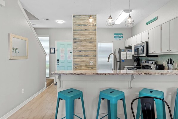Cucina: La nostra cucina è completamente attrezzata, pronta a preparare deliziosi pasti con una grande sala da pranzo elegante e posti a sedere al bar per la colazione. Abbiamo anche incluso il frullatore per i tuoi frullati freschi.