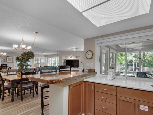 All'interno, l'arredamento rilassante in tonalità neutre miscelato con arredi confortevoli sembrano riecheggiare la tranquillità delle spiagge appena oltre la porta di casa. Inoltre, tre portici offrono ampio spazio per apprezzare i boschi silenziosi rannicchiati contro questa casa vacanza di Destin. Aggiornamenti come TV a schermo piatto in tutto, una vasca idromassaggio nel bagno padronale e opere d'arte originali aggiungono gli ultimi ritocchi a questo paradiso sulla spiaggia.