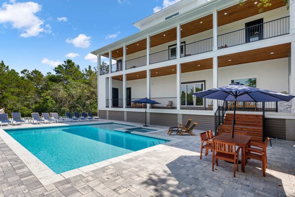The Island Oasis is a new luxury 8 bedroom, 8 bath private home that sleeps up to 20! When you first walk in the front door, it opens to a grand space with 12-foot ceilings and an open-concept kitchen, dining, and living room layout. This is a 3-story home that features brand-new, modern coastal décor and too many features to list! There is a large, private, resort-style pool in the backyard with an attached spa!
