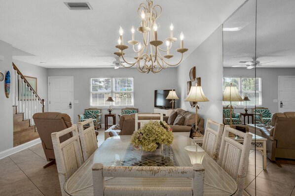 Welcome to Seabreeze Escape, a 2 bedroom, 2.5 bathroom townhome, only about 500 yards to the sugary white sands of Miramar Beach. Step inside to be greeted by an open concept living area, dining area and a kitchen with plenty of counter space. It is the perfect place to unwind after a long day at the beach or to enjoy a meal with your crew. You will also find the washer/dryer located conveniently on this level. Climb the beautiful stairs to the second floor to find the two bedrooms. This townhome sleeps up to 6 with a master bedroom containing a king bed and a guest bedroom with two full beds. Both bedrooms have their own ensuite bathrooms. The master bedroom also grants you access to the private covered balcony. Outside you'll find a cozy back patio highlighted by natural beauty, only a few steps to one of two community pools. Take a short stroll to Pompano Joe's, which is also where you will find the beach access. Seabreeze Escape is a wonderful way to spend your beach days - you will surely enjoy your stay!