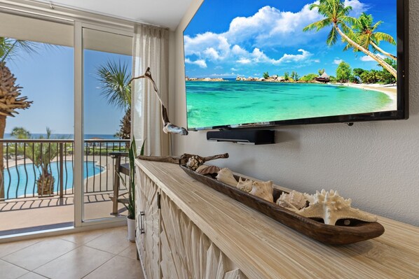 The living room also has direct gulf facing views with high-end bar height outdoor furniture for lounging or dining on the balcony