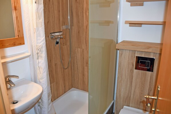 Questo appartamento si trova al piano superiore. Si tratta di circa 25 metri quadrati, dispone di un massimo di 3 adulti e dispone di un arredamento moderno. Nel soggiorno combinato / camera ha due letti singoli con comodino e lampada da lettura e un armadio, un divano con un tavolo e una moderna TV a schermo piatto. Qui si trova anche un tavolo da pranzo con sedie. La moderna cucina è completamente attrezzata con una stufa, un bollitore, macchina per il caffè, mini forno e frigorifero. Per un terzo Gli ospiti possono essere fornite sul divano, se necessario, un letto supplementare. Una piccola culla e seggiolone possono essere forniti gratuitamente su richiesta. All'arrivo gli asciugamani sono forniti ed i letti sono ovviamente già ricoperto di lino. Il bagno ha una doccia, WC, asciugacapelli e vanità.
