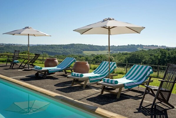 Con ampio spazio sia all'interno che all'esterno, tra cui piscina con terrazza che offre sia sole e ombra, terrazza da pranzo con vista mozzafiato, giardino bianco con tavoli da pranzo all'aperto che offrono ombra pezzata per le giornate calde.