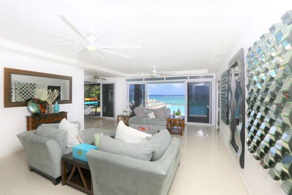 Il secondo soggiorno situato al primo piano del Dreamtime by the Sea ha grandi porte scorrevoli che si affacciano sul Mar dei Caraibi. Ha un arredamento molto elegante ed è confortevolmente arredato con grandi divani. La sala giochi è un'altra area soggiorno con vista sull'oceano e diversi giochi, tra cui Monopoli, Scrabble, Scacchi, Cluedo, giochi di carte e molti altri. C'è un meraviglioso tavolo da bar alto per giocare ai giochi 12+, mentre ti godi la vista sul mare dei Caraibi e sull'area della piscina! Cammina verso una veranda esterna con comodi posti a sedere e viste mozzafiato sul mare!