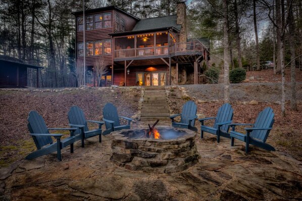 Outdoor - covered front porch; front deck, gas grill, Adirondack chairs; main level covered screened deck, patio couch and chair, coffee table, patio dining table seats 4; lower patio, rocking chairs, side tables, porch swing; stone firepit, 6 Adirondack chairs; 4 wooden creekside chairs