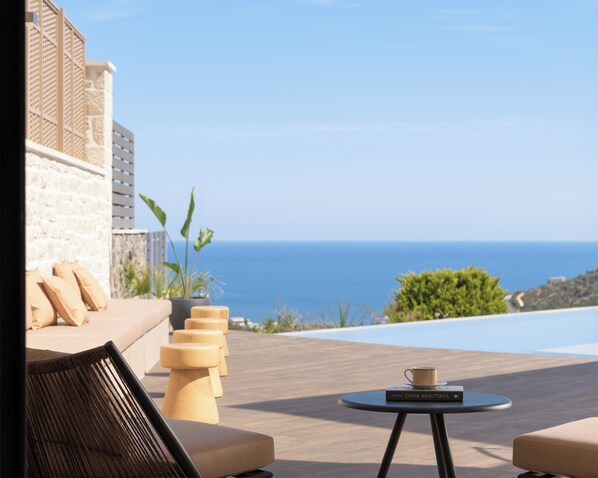 This residence lays in 200m2 outdoor area and is embellished with a 55m² private swimming pool (1,50 meters deep, non-heated), also boasting hydromassage features (3 seater), children’s pool (10m2 metres), sun-beds & umbrellas. Grown-ups can lounge to their premium sun loungers before idling back for al fresco dining under sunset skies, on the outdoor dining area with sea views. One bedroom & Living area have access to the pool area. There is sufficient parking space for up to 3 cars outside of the residence premises. For our younger guests there is a ping pong table to enjoy.