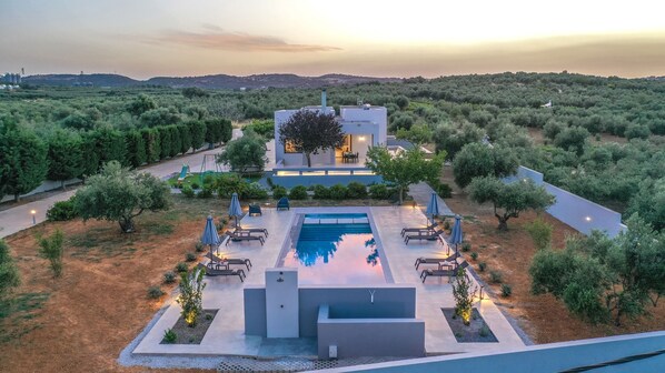 Set in the heart of the authentic village of Perama and just a short drive from the charming seaside haven of Panormos, Nostra Terra Villa is a serene eco-friendly retreat designed for soulful escapes. Crafted to host up to nine guests, the villa blends contemporary elegance with natural simplicity—featuring four stylish bedrooms and sun-drenched, open-plan interiors that extend gracefully to a private terrace. Outdoors, a shimmering heated pool (can be heated with additional fee), shaded dining area with charcoal BBQ, and panoramic surroundings invite relaxed afternoons and golden-hour gatherings. Thoughtfully curated for families and friends alike, the villa offers a range of leisure amenities—from a fully equipped gym to a playground, table tennis, and a mini basketball court—ensuring cherished moments of connection for every generation.