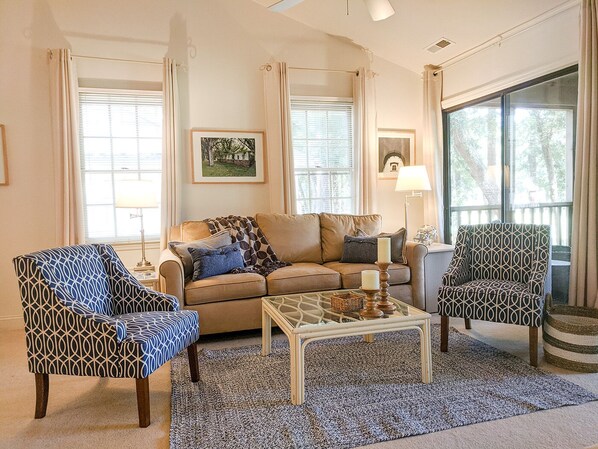 Il nostro condominio al secondo piano in privato, recintato Pawleys Plantation caratteristiche soffitti a volta e una splendida vista del fairway 11. Luminoso e sereno, l'unità è arredata in modo confortevole, con una cucina completamente attrezzata, un balcone schermato, e lavatrice e asciugatrice. La camera da letto principale ha un letto king size e una porta al balcone proiettato, con un bagno completo appena fuori dalla stanza. La seconda camera si trova nella parte anteriore dell'unità, con due letti queen size e un bagno completo. Sul lato tecnologico della recinzione, c'è uno schermo piatto da 50 "SMART TV e lettore Blu-Ray nello spazio abitativo principale, schermi piatti nelle camere da letto, televisione via cavo e internet wi-fi sicuro.