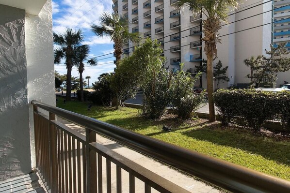 Our Resort View Room consists of two queen beds, one bathroom, a mini fridge, a microwave and a coffee maker, as well as a spacious private balcony located on the first floor with a view of the resort building.