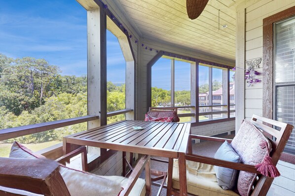 Start the day with fresh coffee and tranquil views of Dunes Lake from your private screened balcony. In the evening, dine alfresco. Spend sun-kissed days swimming in the heated outdoor resort-style pool (6' deep and open during warmer months). The hot tub and heated indoor pool are open year-round. Bring rackets and work on your groundstroke at the tennis courts. In the evening, keep mealtime simple with a cookout at the communal grill area.