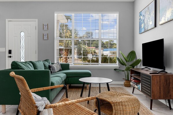 The primary/master bedroom is located on the main floor, furnished with a comfortable queen bed with a nightstand with a charging station, smart TV, and a walking closet for your luggage and clothes. In the master closet, you can find other amenities such as a portable cooler, pack 'n play, compact iron, and the iron boar. This room has also access to the backyard to our beautiful dining/sitting area.