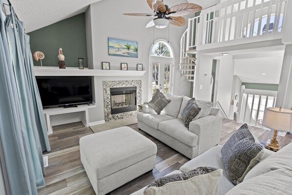 100% renovated with new LVP flooring, new appliances, new furniture, new bathrooms, and new TVs. Located in Cumberland Terrace in Kingston Resort. This split level villa has the living room, dining, and kitchen up half a flight of stairs. There are 2 bedrooms downstair. The 3rd bedroom is a loft above the living room with a trundle. Other features you'll find are dramatic arched windows, skylights, cathedral ceiling, and fireplace. It features free parking, and free high speed WiFi (400 Mbps).