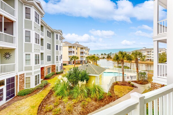 Lovely lake-view condo with pool, balcony, & on-site golf course