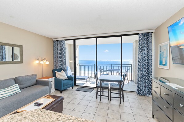 Nel soggiorno, il nuovo divano letto queen con fodera per materasso extraplush garantisce un sonno confortevole. C'è anche una grande poltrona perfettamente posizionata per la vista e la comodità. Una piccola cassettiera e cubi per riporre gli abiti, ecc. C'è anche una grande TV a schermo piatto, opere d'arte colorate, un tavolo da pranzo e sedie che si affacciano sull'oceano.