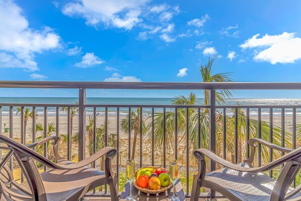 The search for your next vacation stops here! Check out this 3rd floor, direct ocean front condo at the Ocean Reef Resort in Myrtle Beach. This studio is fully furnished with 2 queen size beds and will comfortably accommodate 4 guests. Guests will have access to a full bathroom, and a private balcony with direct ocean front views are also included. This unique layout offers oversized living space for our guests. Other rentals at the resort are much smaller, but this layout features an open floor plan and doesn't feel cramped!