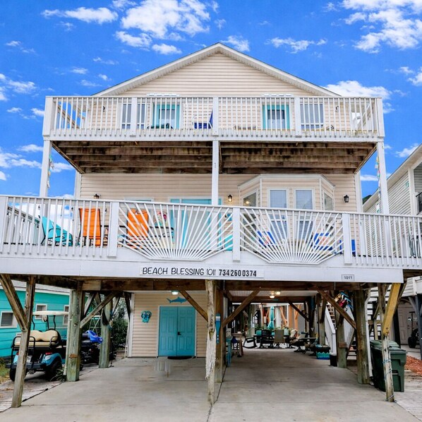 Enjoy the spacious, clean, and beautifully decorated interior just steps away from the ocean, with views from all three decks. It's situated in the prime Ocean Lakes Family Camp Ground, close to the beach, playground, and water park. Three parking spaces are available under the house.