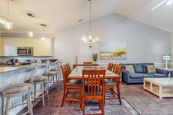 Relax under soaring vaulted ceilings in the Carolina-cool living room. This open, central hub is furnished with a comfy sofa, love seat, and extra chair. Catch a movie or watch a game on the 46” flat-screen TV.