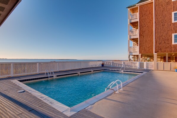 Always Included, complimentary linens and made beds! Soundfront living at it's finest awaits you and your family at 4 Shore! This Landings at Sugar Creek Condo is located at MP16 in Nags Head, overlooking the Roanoke Sound. From your private balcony, there are stunning views and a sunset that you will never forget! There's a community pier that provides direct, private access to the sound for crabbing, kayaking or windsurfing. Nearby are great local restaurants, shopping and numerous family attractions. Jennette's Pier, Jockey's Ridge and Bodie Island Lighthouse are all in close proximity to the property.