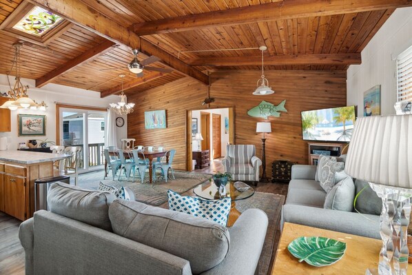 Get ready for your ultimate Outer Banks vacation to begin as you enter this gorgeous Nags Head cottage on the Main Level, accessed via a single set of stairs. The central Living Area eagerly welcomes you with high ceilings, beautiful woodwork, stained glass skylights, and a large, Flat Screen TV that's perfect for relaxing with your favorite shows after a day at the beach. The adjacent open-concept Kitchen boasts the perfect space for whipping a delicious meal that the whole family will love while the nearby Dining Area has seating for 6. Head through the sliding glass doors to the Crow's Nest Deck with views of the ocean that will have you grinning from ear to ear.