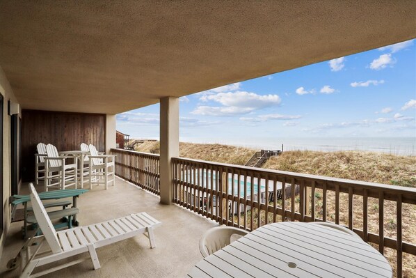 Community Elevator, Community Pool, Community Grills, Direct Beach Access, Ocean Views, Covered Deck, High Chair, Pack-n-Play, TV, DVD Player, Dishwasher, Microwave, Washer & Dryer, Crock-Pot, Beach Chairs.