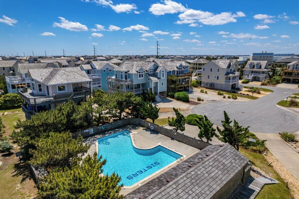 Family Ties: Oceanside home in the Seven Sisters Community in Nags Head with a game room with a pool table, a private hot tub and access to the community pool all while being just a short walk to the beach.