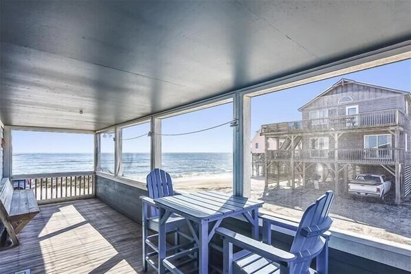 Just steps from the beach with extensive ocean views, this beautiful semi-oceanfront home is a favorite with repeat renters. (It evens starts out with a complimentary 1 PM check-In to make the most of your vacation time!!) Located at the quiet, southern end of the highly desirable South Nags Head area (Mile Post 20.5); this area is surrounded by the Cape Hatteras National Seashore, close to Bodie Island Lighthouse, Oregon Inlet Fishing Center and the Outer Banks Fishing Pier with shopping and restaurants only 5 miles away. Designed and decorated to encourage a relaxing vacation lifestyle, this 3 bedroom home has open floor plan anchored by a large screen porch with beautiful