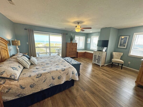 Ampia Master Suite con letto king size, area salotto, bagno completo e balcone privato con vista sull'oceano; Camera da letto con la regina; Bagno completo con solo doccia; Camera da letto con due letti matrimoniali; Lavanderia con lavatrice e asciugatrice.