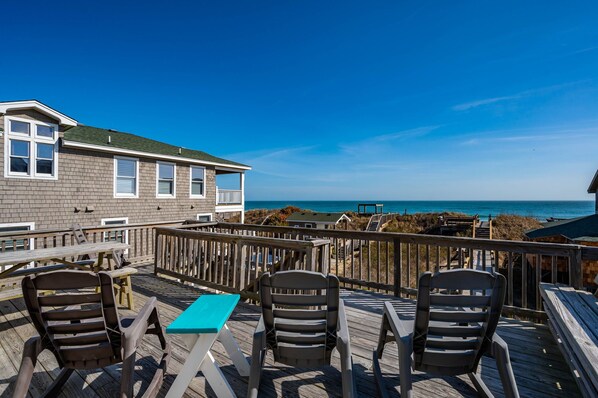 Vacations are meant to escape to paradise and you can do just that at Sea Rest! This oceanfront home lets you relax on the sandy beach that is right in your backyard. Enjoy your morning coffee on the top-level sun deck or the dune top deck and watch the awesome sunrise over the ocean, listen to the waves and just relax. This home offers two floors of living space and bedrooms to comfortably accommodate your family. The top level serves as your main living space with an open floor plan where you can easily move from the kitchen to the dining room to the living room. Grab a quick breakfast bite at the kitchen island or plan a delicious family dinner in the well-equipped kitchen. The living room is the perfect spot to read a book or to watch your favorite movies together. When you are ready to unwind after your busy day at the beach or out sightseeing relax in the private hot tub on the lower level.