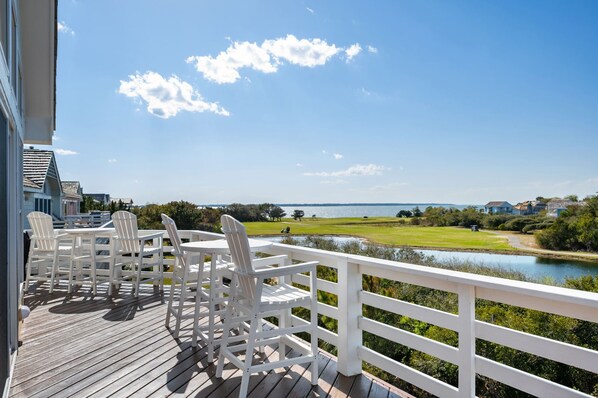 Soundbreeze Sunset offers views of the lush green fairways of the Nags Head Golf Links in the exclusive community of The Village at Nags Head. This is the ideal home for a peaceful getaway to the Outer Banks. The spacious decks provide ample opportunities to enjoy the sound views and the awesome OBX sunsets. The bright and airy great room is perfect for relaxing, dining and with the fully equipped kitchen, you'll want to prepare your favorite meals for everyone to enjoy. The sunroom on the top level and the den on the lower level provide extra spots to relax and enjoy a book or some games.