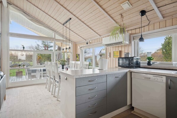 The kitchen contains all modern kitchen equipment, e.g., air fryer, toaster, hand blender, hand mixer, toaster, etc. In the room, there is a wide selection of various games and children's books, as well as different outdoor toys in the cushion box on the terrace.