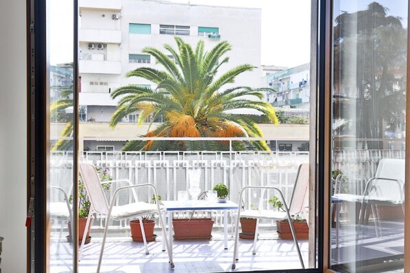 - Grande balcone attrezzato con tavolino e sedie.
