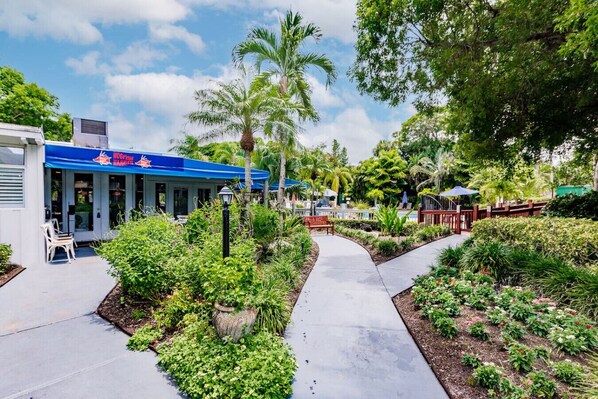 The resort is approximately 30 miles/minutes from Fort Myers International airport (RSW). Free parking is provided on the premises. Biking/ walking to the beach is possible and Ubers/Lyfts or taxis are plentiful in Naples.