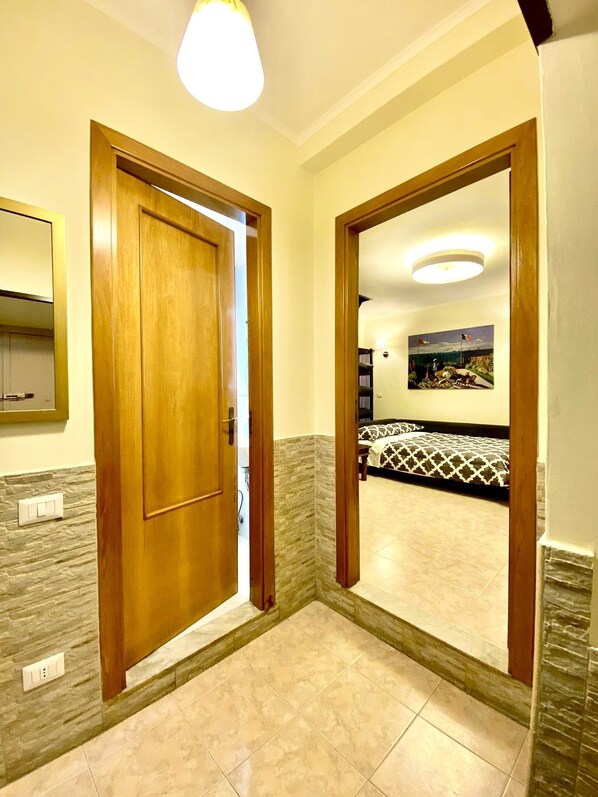 L'appartamento offre tutte le comodità necessarie per farvi desiderare di tornare proprio in questo luogo accogliente e ideale. L'accesso all'abitazione avviene salendo due gradini dall'atrio coperto del palazzo.