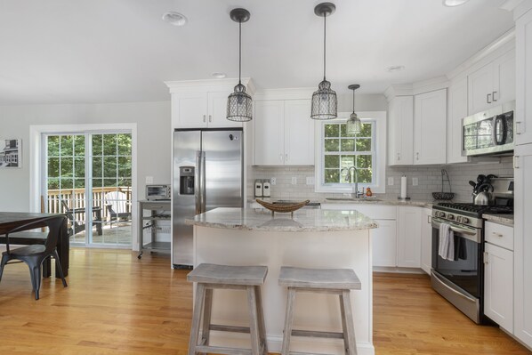 The fully stocked kitchen is a chef’s delight, equipped with stainless steel appliances, granite countertops, and all the essentials. The kitchen’s island and adjacent dining table offer ample space for gathering, making it ideal for hosting family dinners or casual brunches.