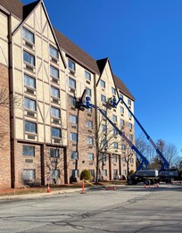 The clerk said that loud remodeling construction noise would begin right outside our window at 8:00am. However, at 7:00am the diesel engines started and they warmed up for 30 minutes, then the racing engines, banging and hollering began. (See photo)