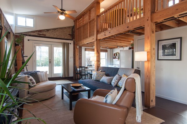 La zona giorno aperta ha mattoni a vista, soffitti da 13 ", camino a gas, comodo divano letto, poltrona reclinabile in pelle, schermo piatto da 50" e molti posti a sedere per 4 persone.
